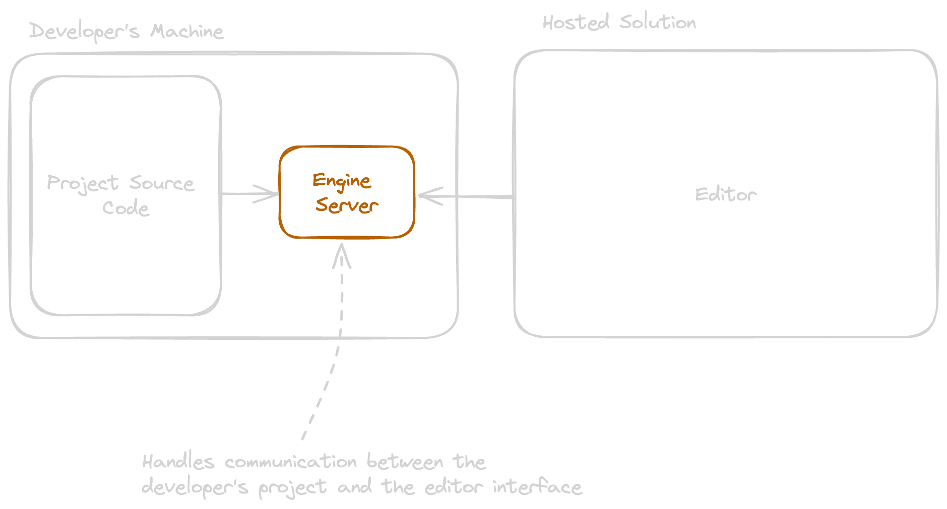 - A development server that would run locally on the developer's machine, connecting local components, assets and state (such as the scene) with the hosted editor interface. The editor client would access this server on