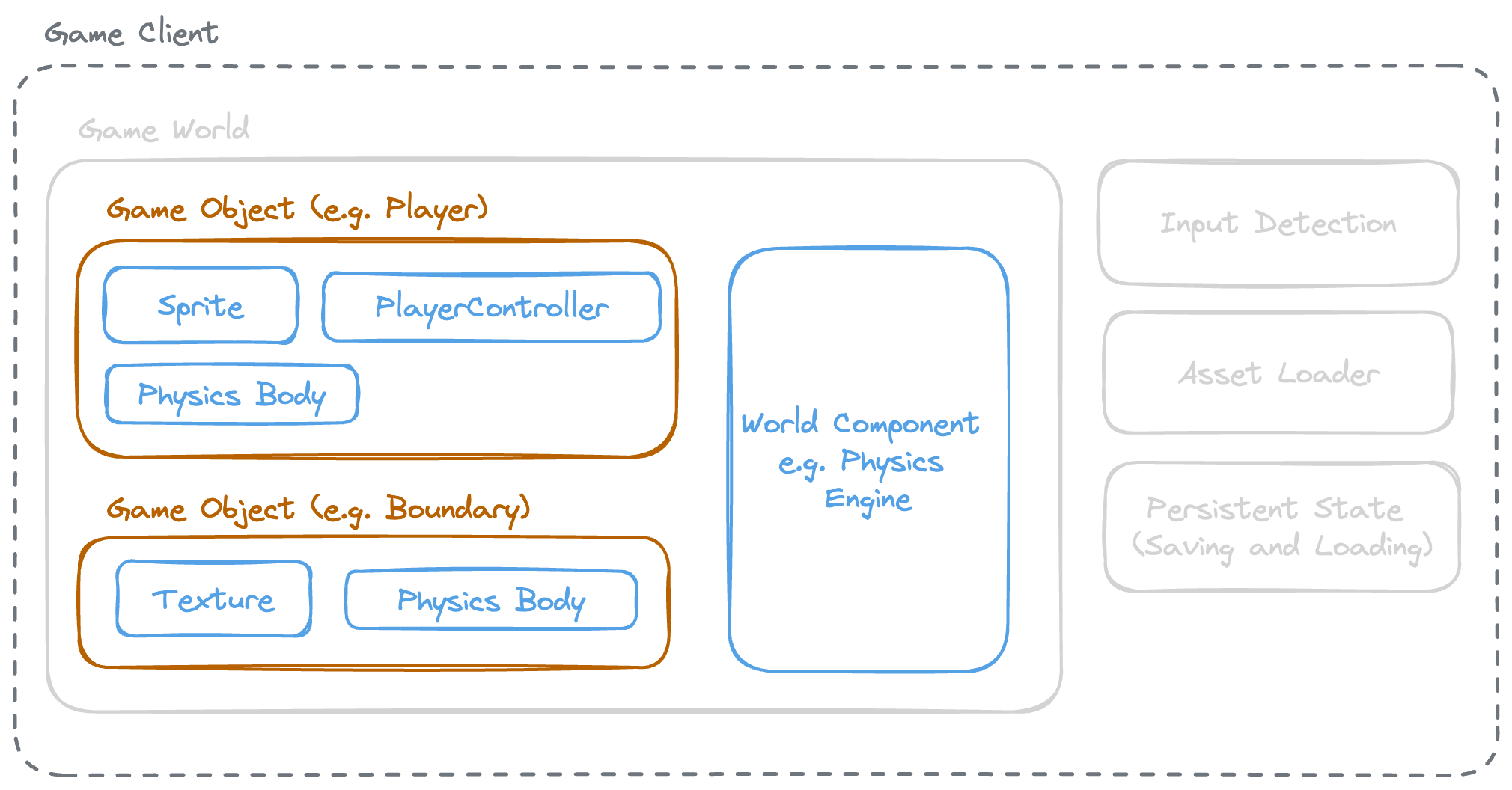 - The overarching game client. This is what manages things like user input, loading assets (such as sprites, sound files, etc), loading and unloading scenes created with the editor and so on.